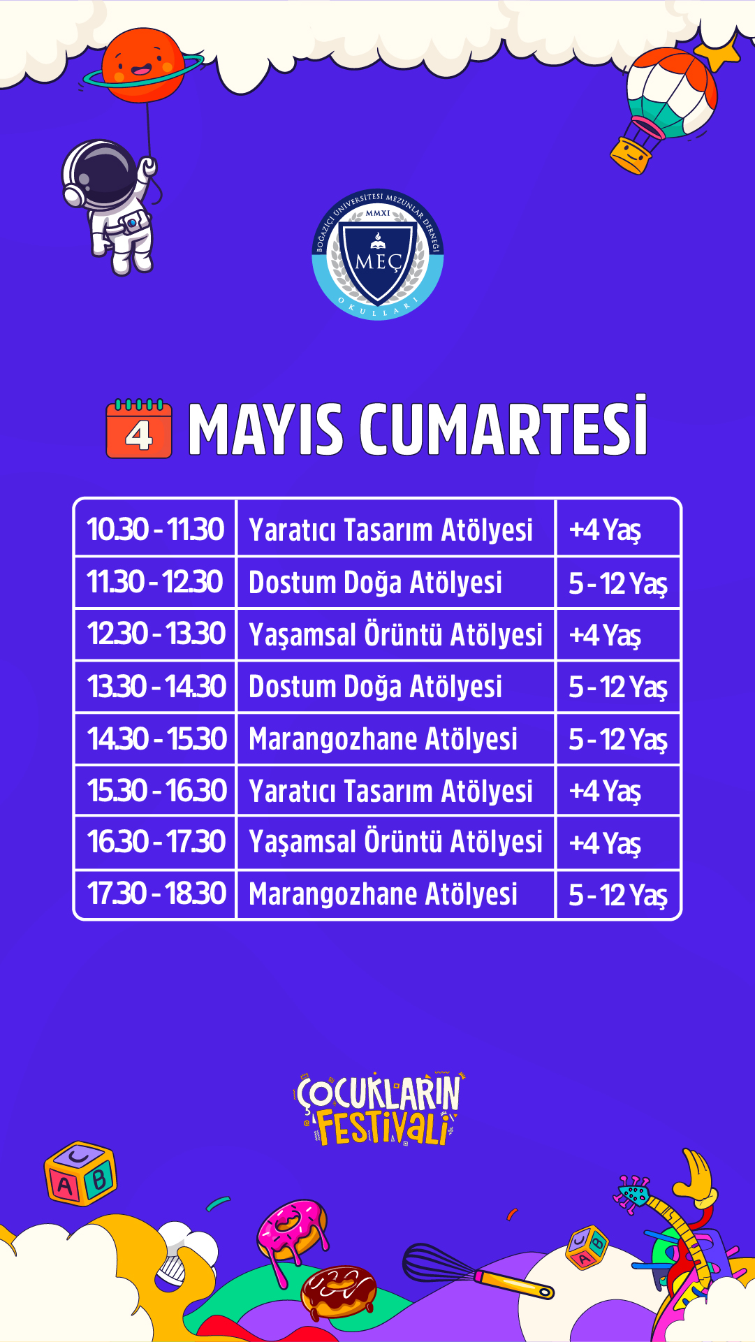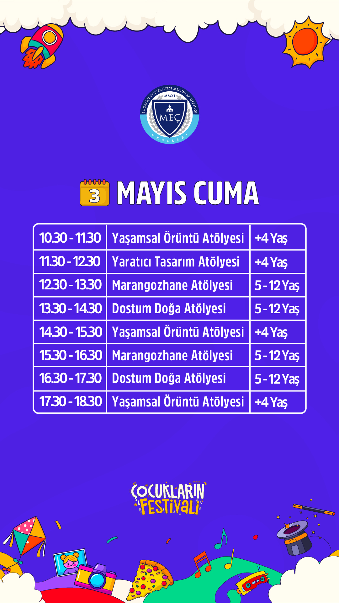 Resimden müziğe, mozaikten dramaya, animasyondan karikatüre, fotoğrafçılıktan sihirbazlık gösterilerine, dijital sanattan kodlamaya, danstan deneysel faaliyetlere kadar çok geniş bir aktivite yelpazesi ile çocukların hem bireysel hem de kollektif olarak dahil olabileceği eğitici ve öğretici atölyeler oluşturulacaktır.