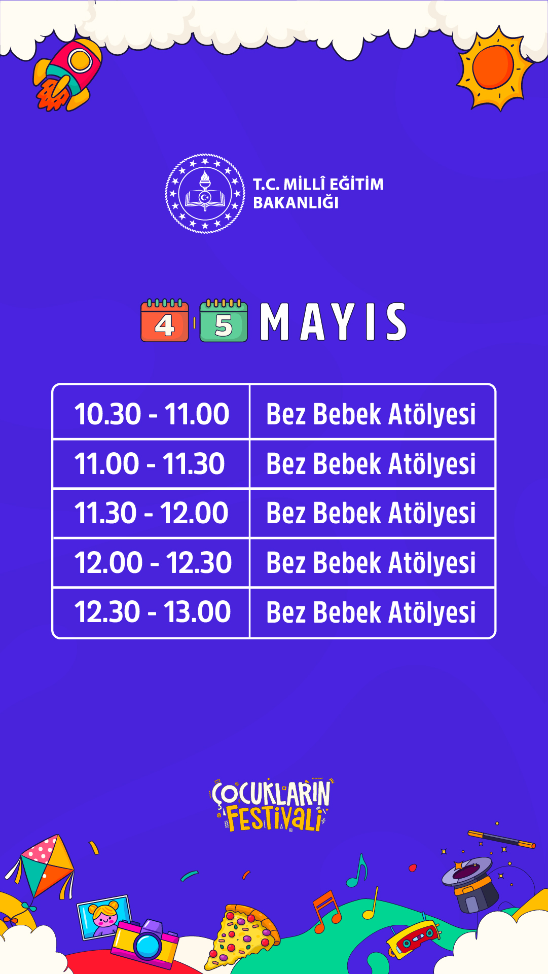 Bu bağlamda Çocukların Festivali kapsamında yapılacak birçok atölye ile çocukların; el becerilerini, özgüvenlerini, zihinsel ve bedensel gelişimlerini arttırmak ve de aldıkları kazanımlar ile de toplumda hem bilinçli hem de faydalı bireyler olmaları temeli amaçlanmıştır.
